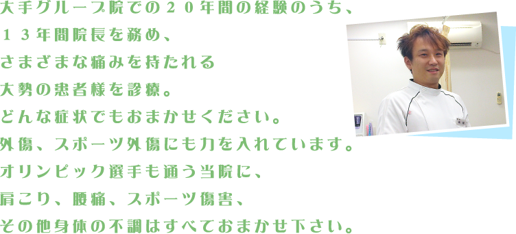 また、来院した時は暗い顔をされていた方に、院を出る時は明るい笑顔になっていただくには、身体的な痛みだけではなく、精神的な不安も取り除く必要があると考えています。